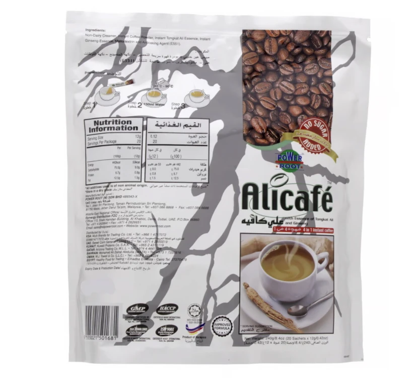 لا يوجد سكر مضاف 4 في 1 قهوة سريعة التحضير مع خلاصة تونغكات علي والجينسنغ 20 كيس |