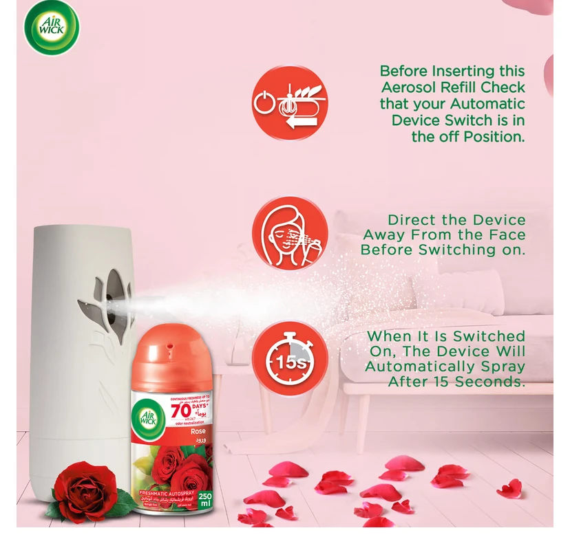محتويات العبوة: تحتوي هذه العبوة على أداة رش تلقائي واحدة من Air Wick Freshmatic، و1 عبوة إعادة تعبئة وبطارية AA رش تلقائي من FRESHMATIC: يطلق تلقائيًا رشات من عطر الورد لانتعاش مستمر يدوم حتى 70 يومًا: تطلق مجموعة Air Wick Freshmatic عطرًا يدوم حتى 70 يومًا. مثالية للمنزل: مجموعة رش تلقائي من معطر الهواء من Air Wick Freshmatic مثالية لغرفة النوم والمرحاض وغرفة المعيشة |