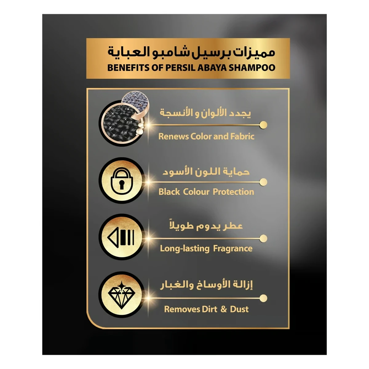 الحل الكامل للعناية بالعباءة: شامبو العباءة برسيل 2 في 1 هو الحل الكامل الذي يوفر لك شامبو عباءة سوداء وناعمة وعطرية تمامًا. ما عليك سوى سكب المنتج بمفرده دون الحاجة إلى أي منتجات إضافية! حماية اللون الأسود: تضمن التركيبة المصممة خصيصًا لشامبو العباءة برسيل 2 في 1 بقاء اللون الأسود للعباية متألقًا، غسلة بعد غسلة. نعومة القماش: ستظل العبايات ناعمة وحريرية وناعمة بعد غسلها بشامبو العباءة برسيل 2 في 1. عطر يدوم طويلاً: يوفر برسيل عطرًا لطيفًا وطويل الأمد للعباية يدوم طويلاً بعد الغسيل. يأتي شامبو العباءة برسيل 2 في 1 برائحتين فاخرتين: الورد والعطر الفرنسي. طريقة الاستخدام: للغسيل اليدوي، استخدمي 55 مل من شامبو العباءة برسيل 2 في 1. للغسالات ذات التحميل العلوي، استخدمي 165 مل وللغسالات ذات التحميل الأمامي، استخدمي 220 مل من شامبو العباءة برسيل 2 في 1. صب المنتج ببساطة من تلقاء نفسه دون الحاجة إلى أي منتجات إضافية! |