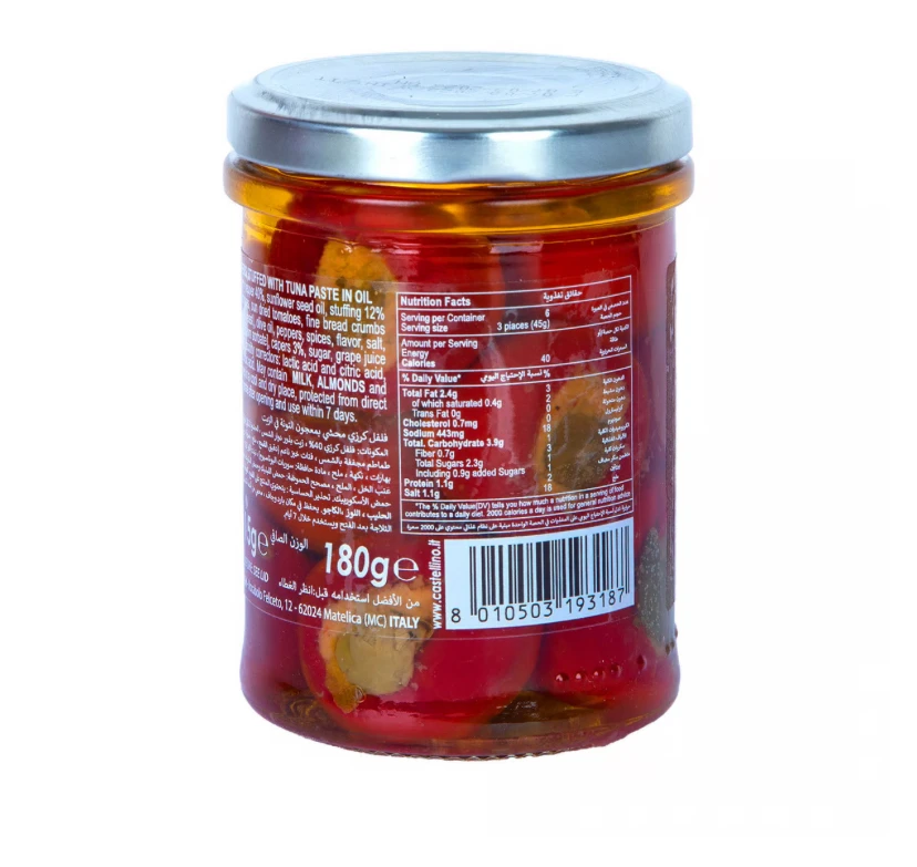 فلفل كرزي أحمر لذيذ محشو بمعجون التونة في الزيت يقدم مزيجا فريدا من النكهات تم الحصول عليها بعناية لضمان الطعم والنكهة المثالية يمكن الاستمتاع بها كوجبة خفيفة مستقلة، أو تقديمها كمقبلات، أو استخدامها كعنصر في أطباق مختلفة إضافة مثالية لأطباق المعكرونة أو البيتزا أو السندويشات أو حتى المارتيني، حيث يمكنها إضافة لمسة فريدة ولذيذة إلى الوصفات معبأة ومخزنة بشكل صحي للحفاظ على خصائصها الطبيعية |