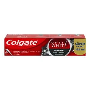 معجون أسنان كولجيت أوبتيك وايت بالفلورايد والفحم يوفر عملية تبييض متقدمة بقوة الفحم. تركيبته بالفلورايد تقوي المينا، وتحارب التسوس، وتحمي ضد تسوس الأسنان بينما يساعد الفحم على إزالة البقع السطحية لابتسامة أكثر إشراقًا.
