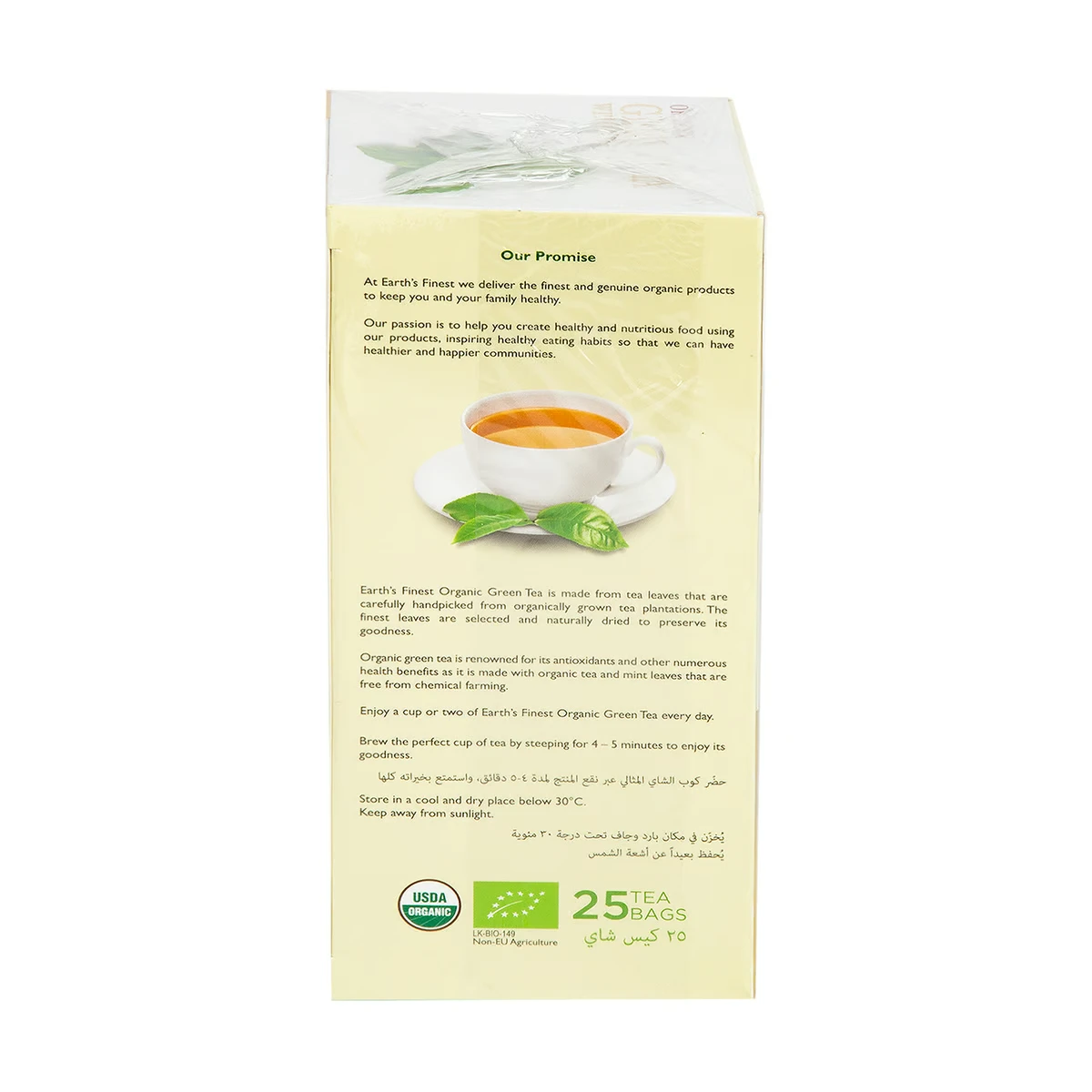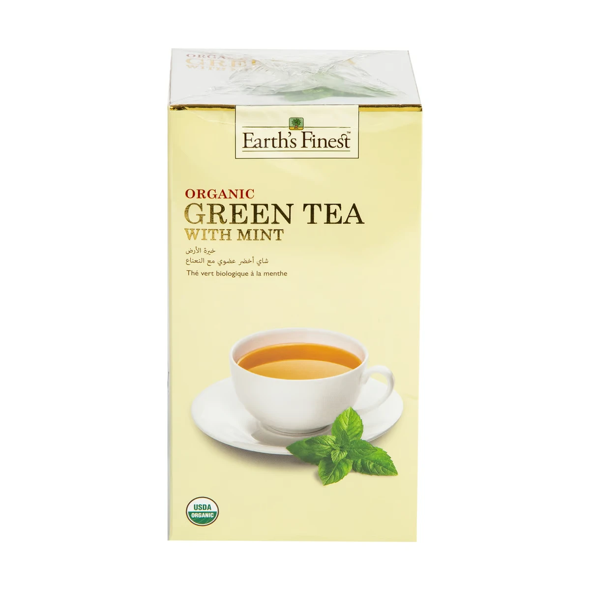 شاي أخضر عضوي مع النعناع المنعش والطبيعي، مصنوع من أجود أنواع الشاي الطبيعي. |
