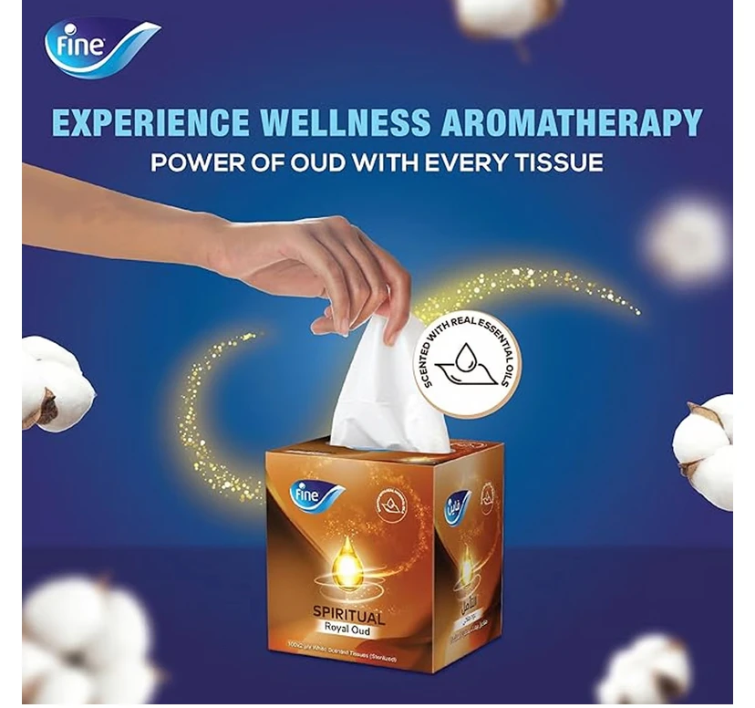 تجربة المنديل العطري الصحي: ارفع من رفاهيتك باستخدام مناديل الوجه الجميلة من فاين ويلنس الممزوجة بالزيوت العطرية الأصلية المشتقة من النباتات. تم تصميم هذه المناديل لتعزيز صحتك الجسدية، وخلق جو منعش.