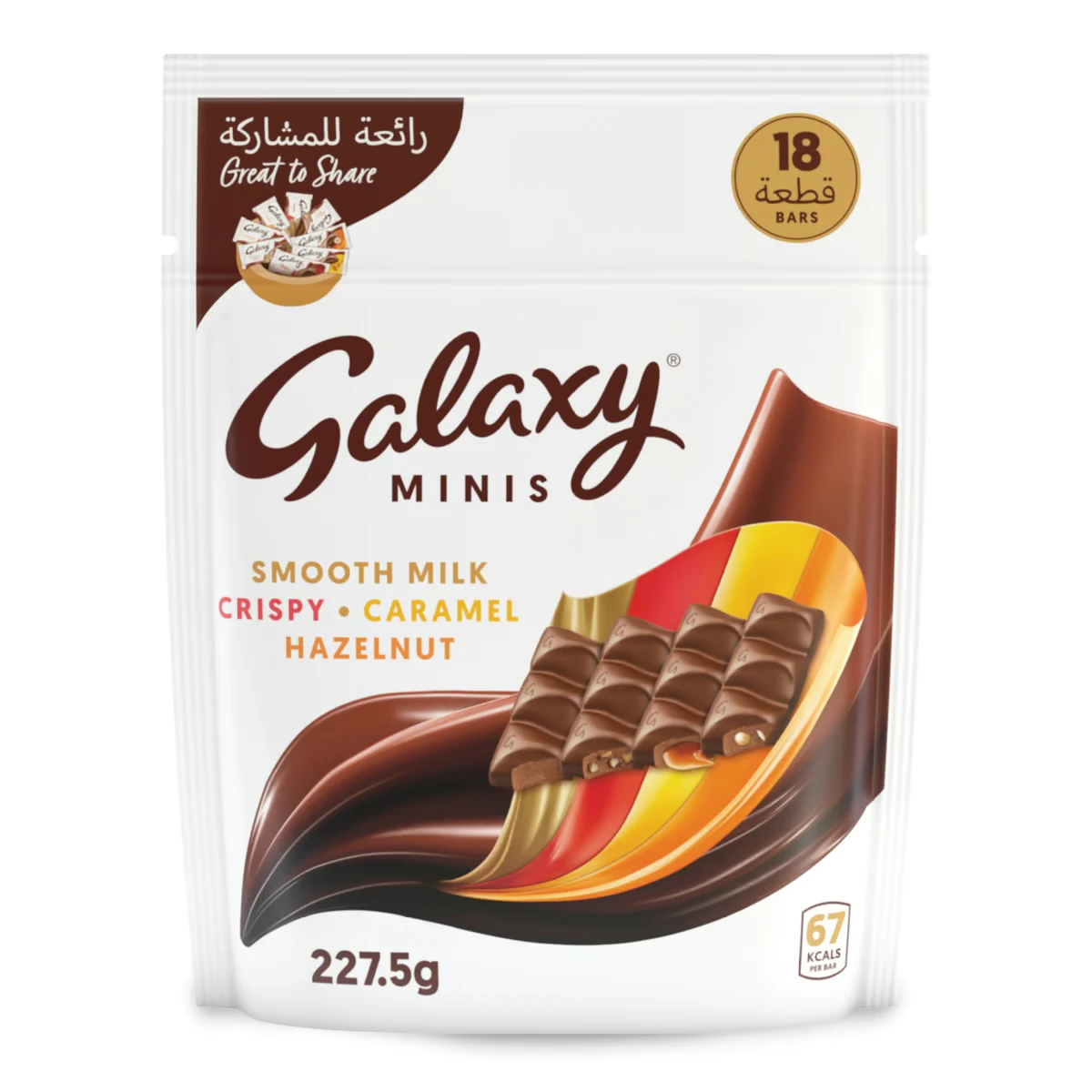 "قالب شوكولاتة جالاكسي مينيس اللذيذ يتميز بمزيج لذيذ من الحليب، المقرمش، البندق، والكراميل. يوفر هذا القالب تجربة شهية ومتنوعة لعشاق الشوكولاتة، مع مزيج من النكهات الغنية والمقرمشة التي تضفي لمسة فريدة على كل لقمة." |