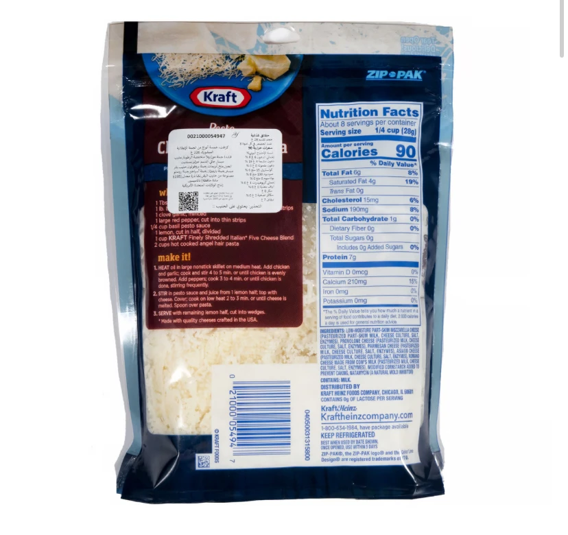 خمسة أجبان إيطالية جبنة طبيعية مبشورة تم تقطيع الجبن اللذيذ مسبقًا ليكون جاهزًا لإضافته إلى طبقك المفضل جبنة كرافت الطبيعية المبشورة مصنوعة دائمًا من الحليب الطازج، وهي مثالية لأطباق الباستا والبيتزا والسلطات المفضلة لدى عائلتك وغير ذلك الكثير. يمكنك حتى تناوله كوجبة خفيفة مرضية |