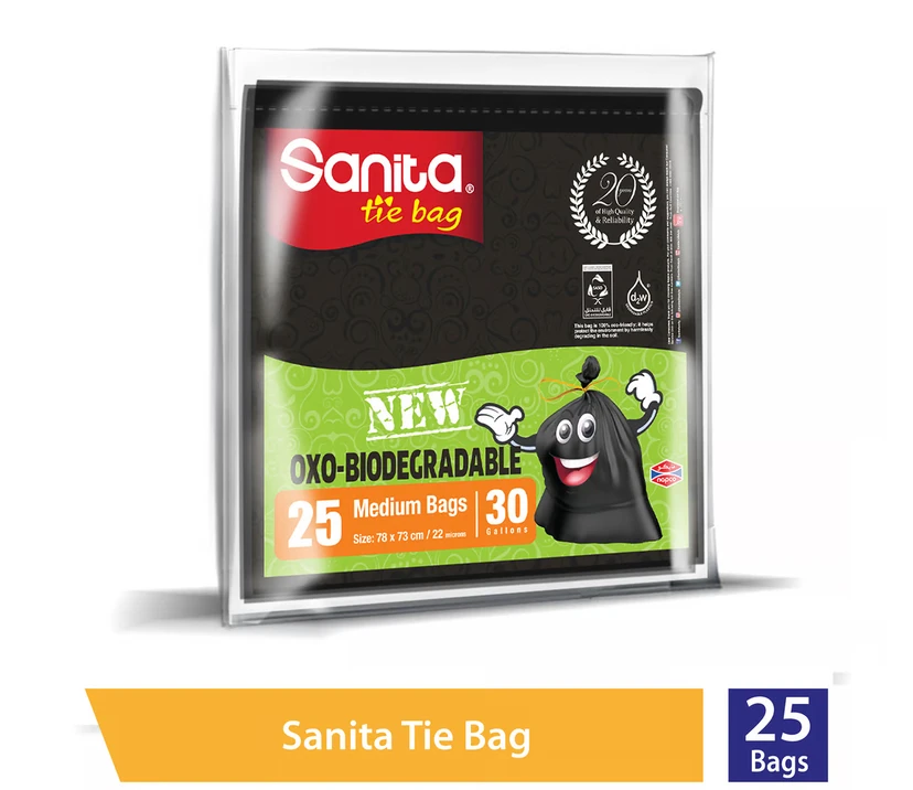 سانيتا ربطة أكياس نفايات قابلة للتحلل بالأكسجين وسط 30 جالون مقاس 78 × 73 سم 25 قطعة