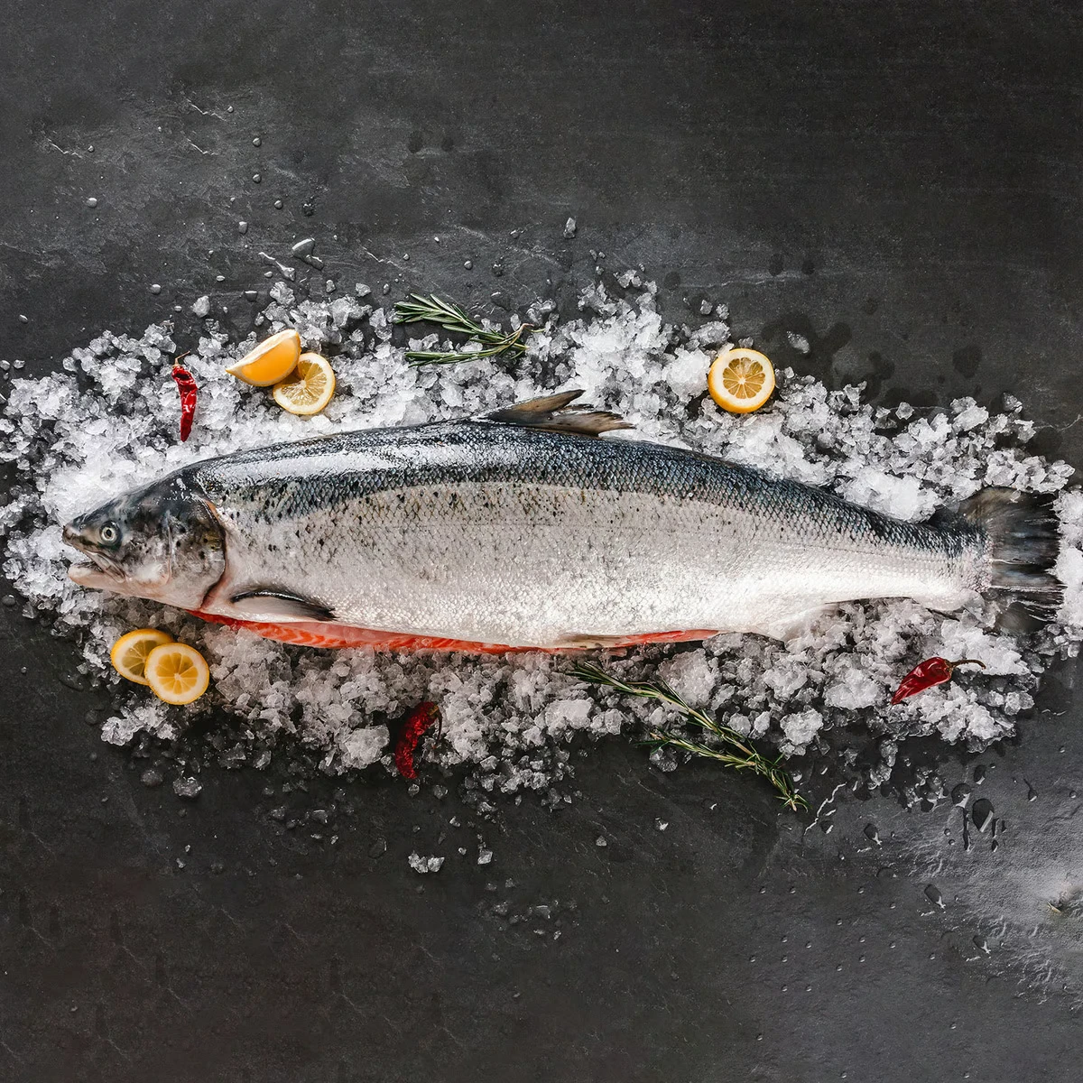 تمتع بجودة سمك السلمون الاسكتلندي الكامل والمنزوع من الأحشاء، يتميز بنكهة غنية ومثالي لإعداد أشهى الأطباق البحرية." |